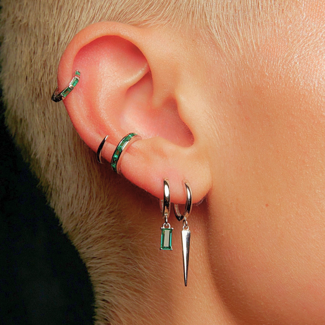 Glamourous emerald toned baguette huggie earrings, perfect for daily wear in upper, mid or lower piercings.