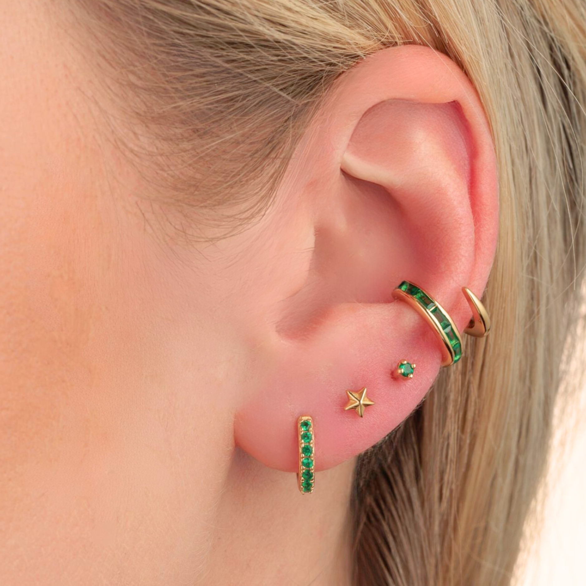 Get the ultimate green ear stack with a pair of huggie earrings and two flat back studs