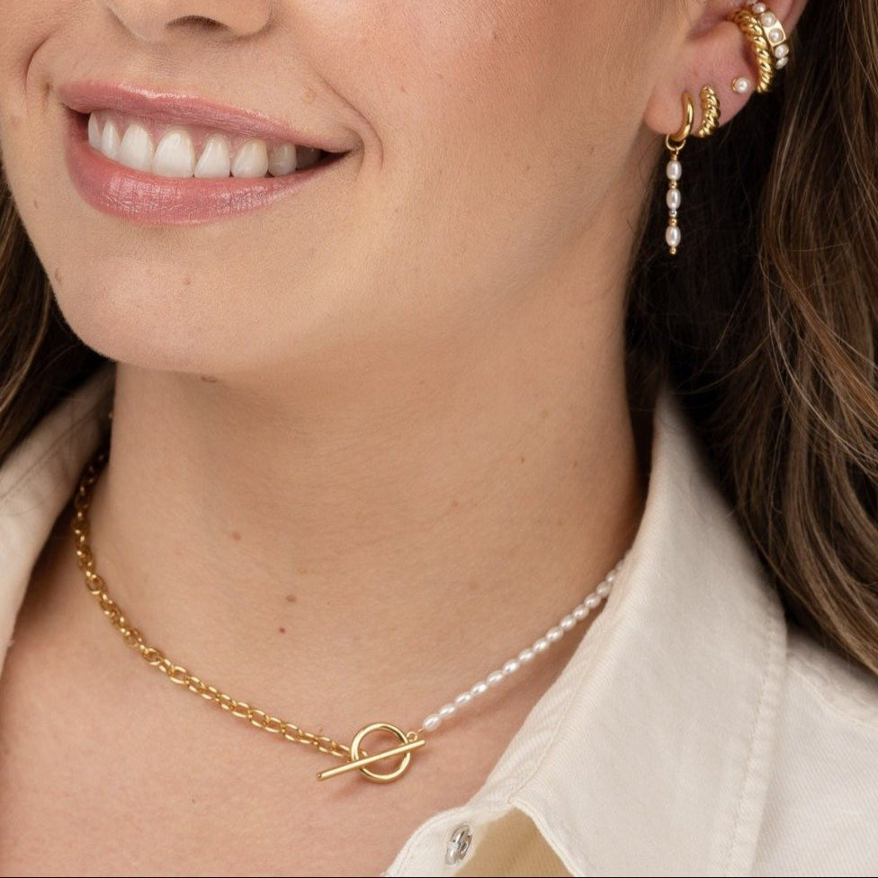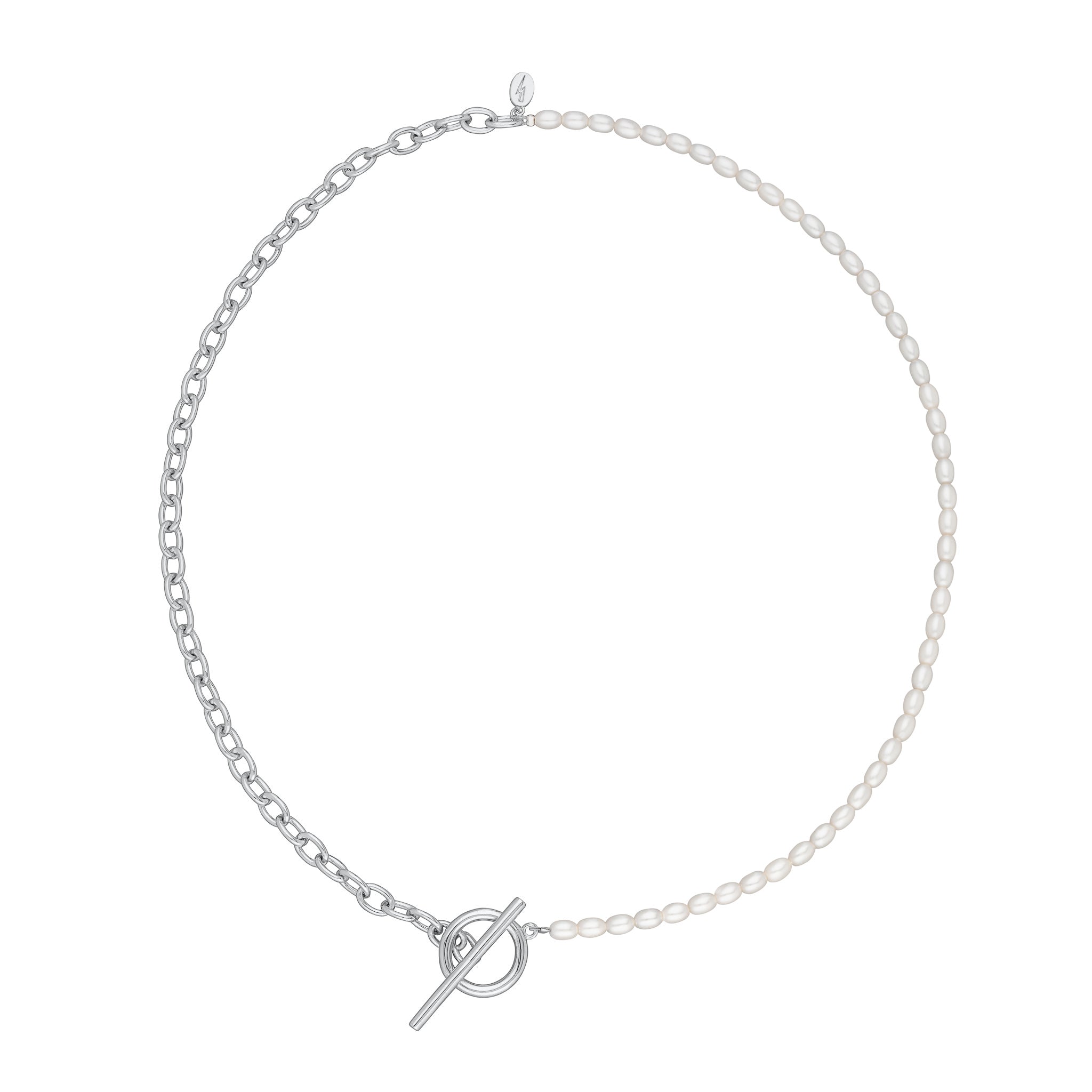 Unlock luxury with this Hannah Martin Pearl and Chain T-Bar Necklace. Through its half and half design, your look will shimmer and shine with decadent pearls.