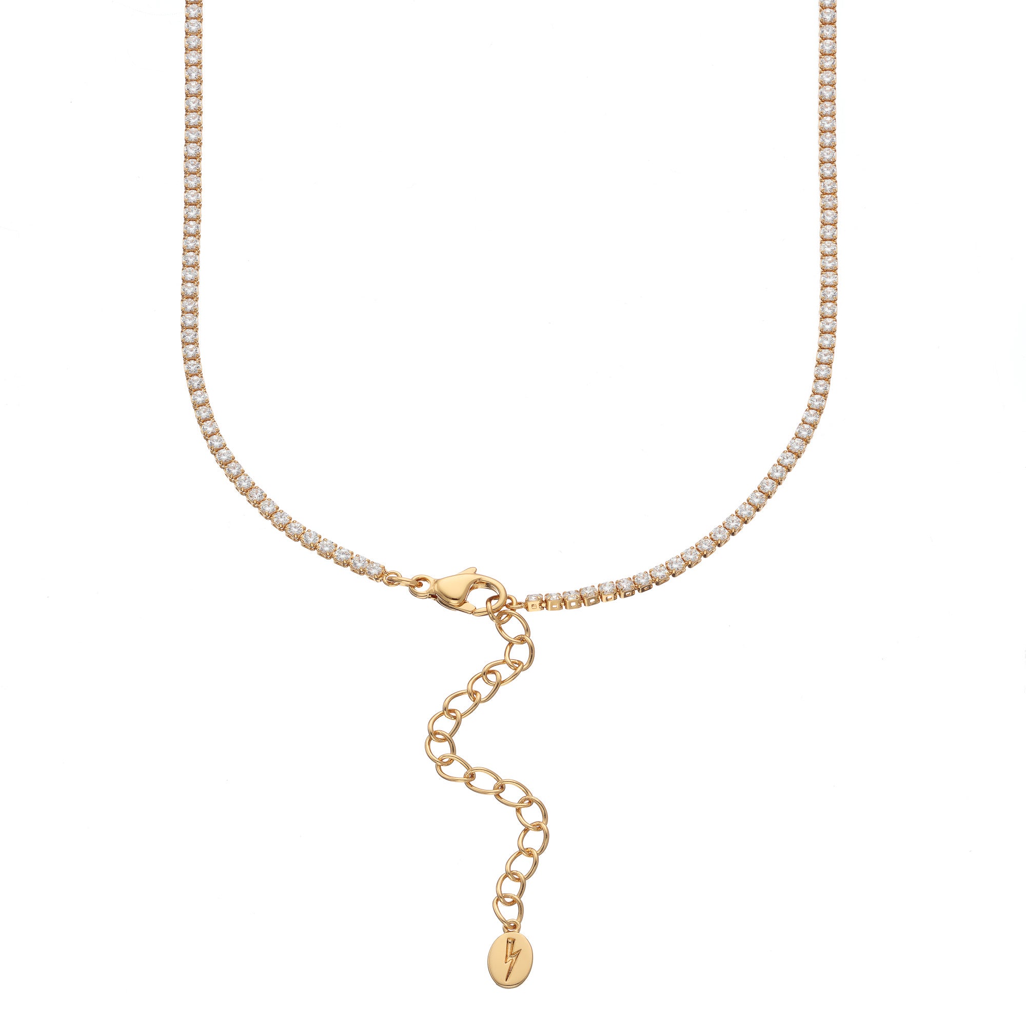The perfect layering accessory to add delicate shimmer, this gold slim classic tennis chain is a jewellery box must-have. Oozing elegance this necklace is the queen of sparkle with a continuous strand of round faceted cubic zirconia stones that radiates a dazzling shimmer as it catches the light. Diamonds are not just for special occasions and this necklace isn’t either, style with an evening dress, wear with jeans and a t-shirt or rock up your look at a festival. This slim classic tennis chain is a stunning investment piece ideal for everyday wear and is sure to become your next go-to favourite accessory that will never go out of fashion.