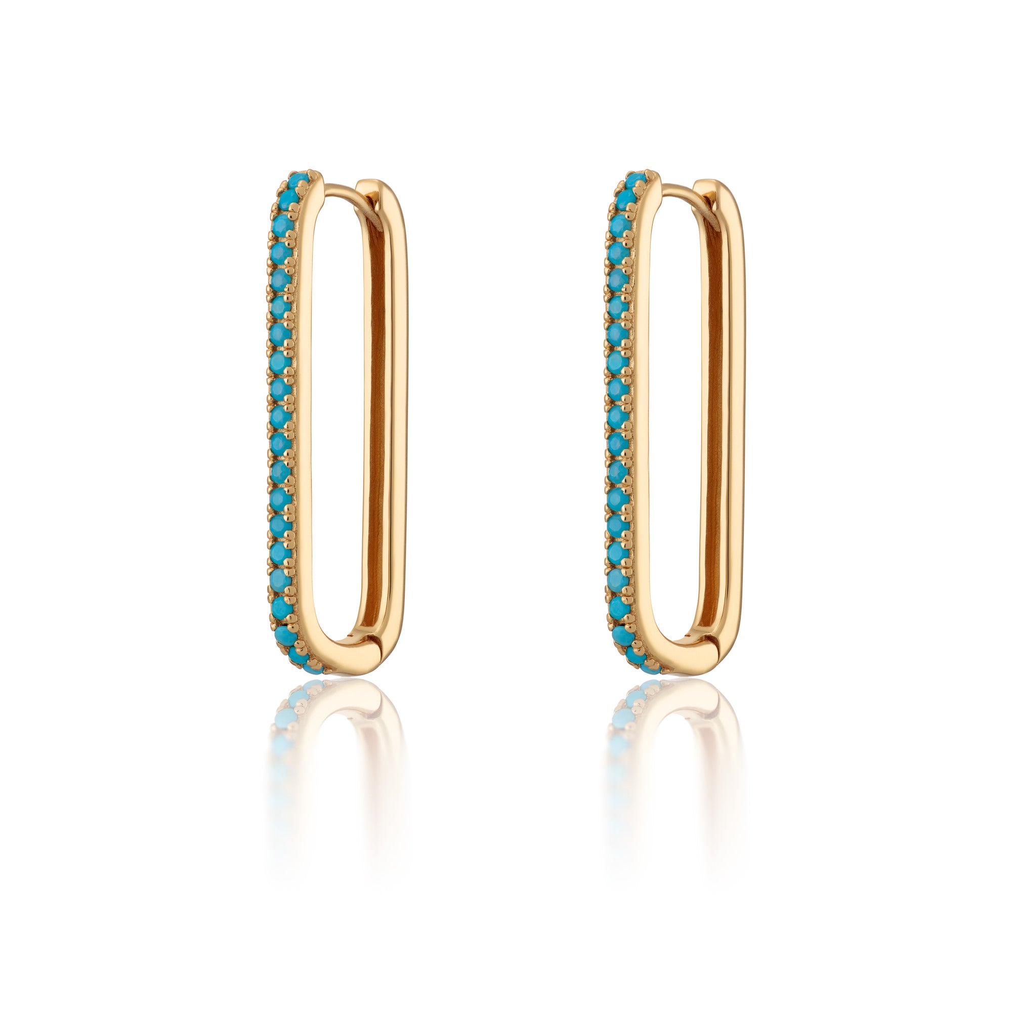 Make a statement with these elongated oval hoop earrings set with vibrant turquoise stones for a bold, summer twist