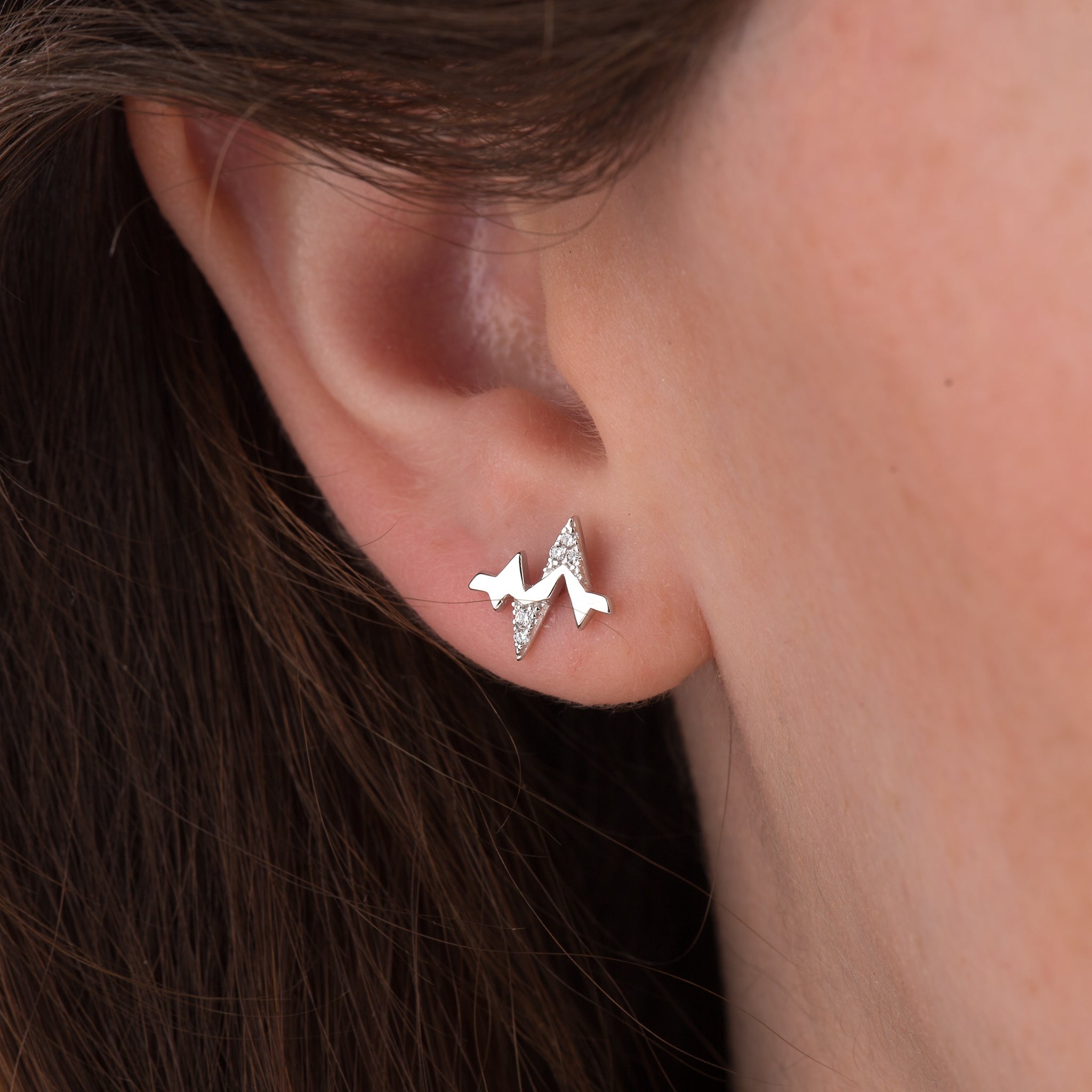 Small heartbeat stud earrings with some pave sparkle and shades of punk and Bowie.