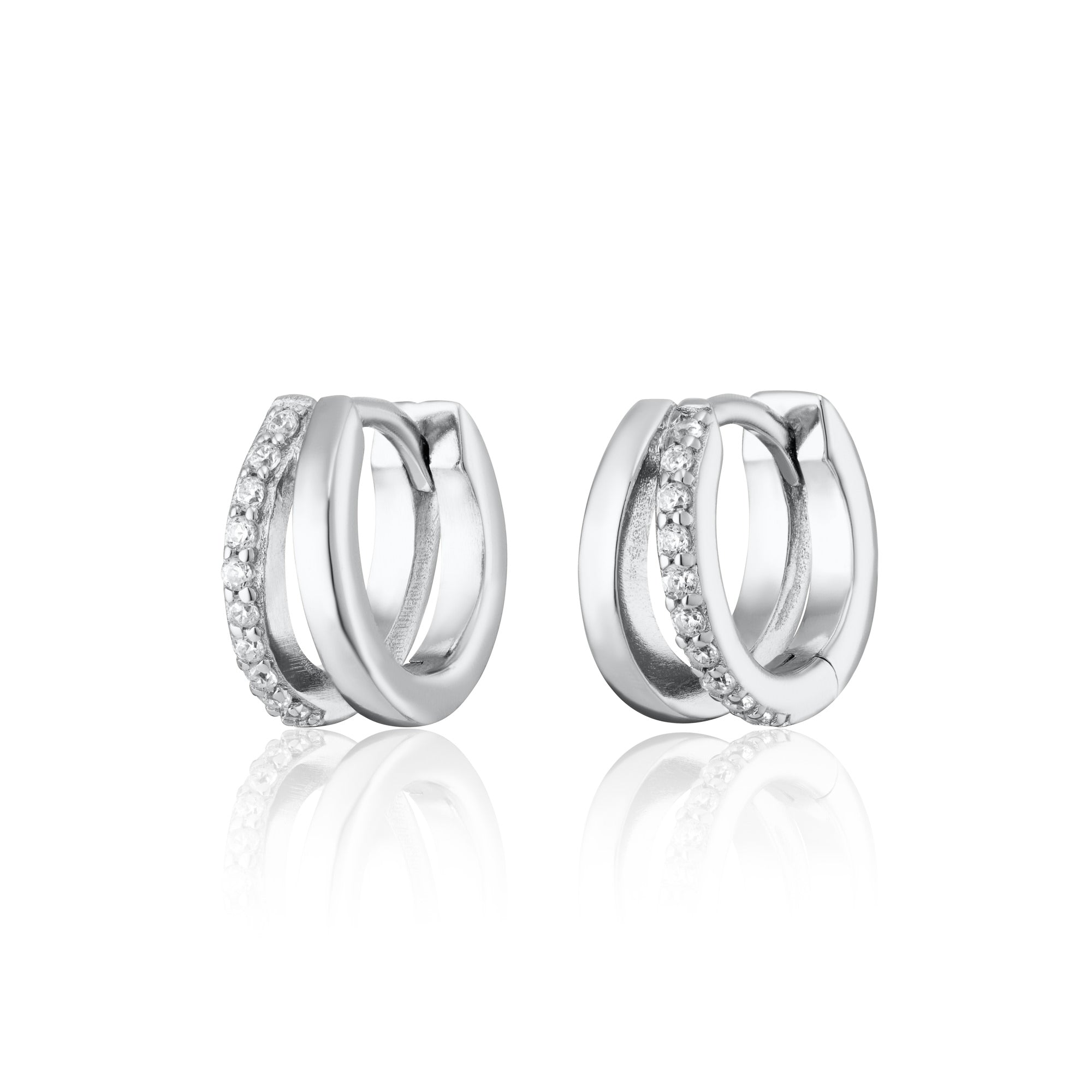 These illusion split huggie earrings comes with a single post and two stunning hoops to maximise visual drama without the extra piercing. Featuring a single earring post and two split hoops, one polished and one studded with clear cubic zirconia stones. The contrasting bands deliver depth, and subtle sparkle for a stylish 2-in-1 earring design that creates and instant ear stack. Add to your ear lobe or helix piercing for a double hoop earring that gives twice the statement your ear curation deserves.
